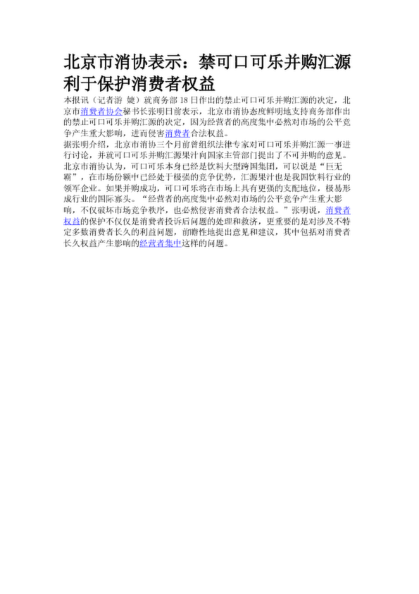 北京市消協表示:禁可口可樂并購匯源利于保護消費者權益(17.55KB)
