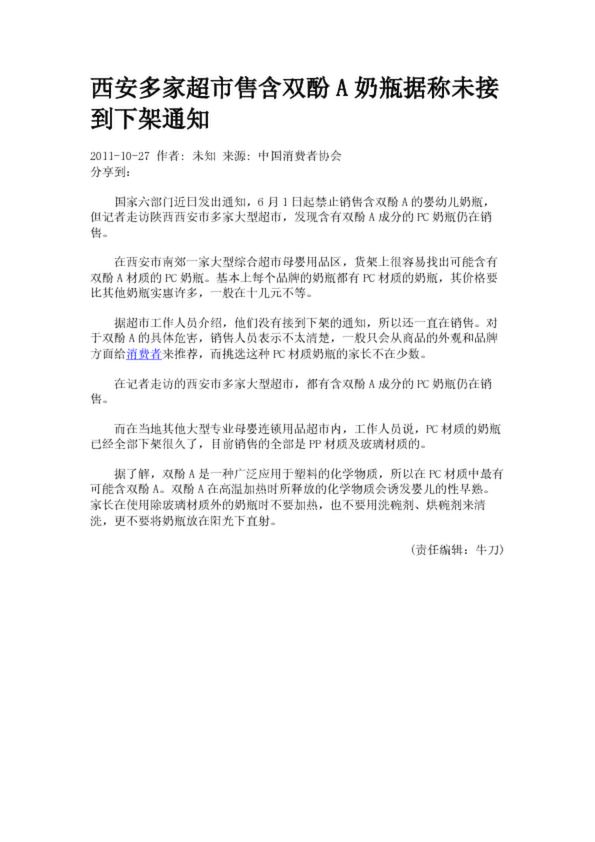 西安多家超市售含雙酚A奶瓶據稱未接到下架通知(2.73KB)