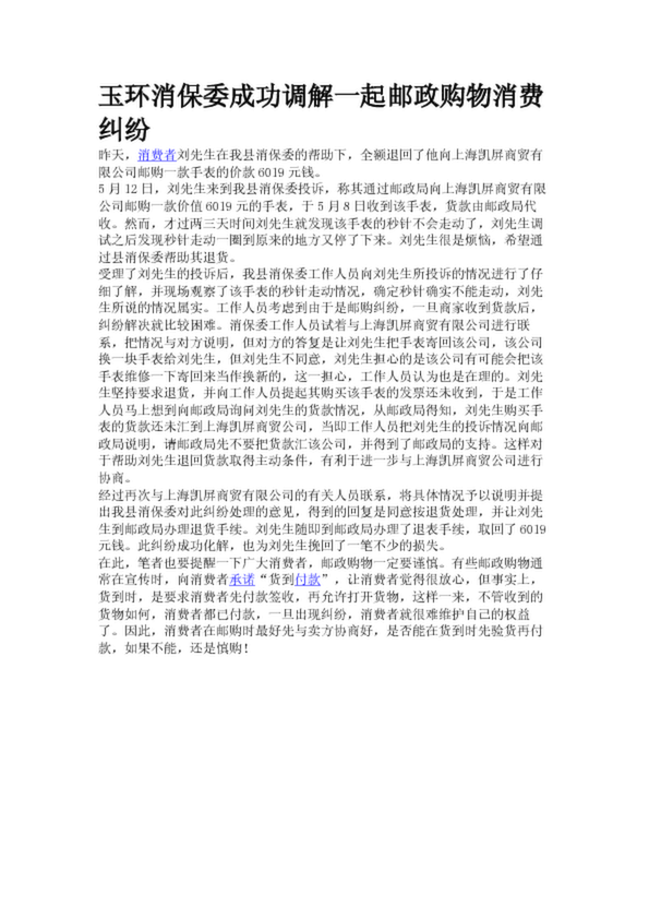 玉環消保委成功調解一起郵政購物消費糾紛(18.52KB)