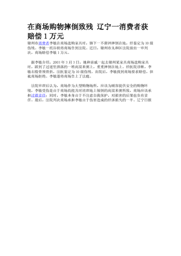 在商場購物摔倒致殘 遼寧一消費者獲賠償1萬元(16.92KB)