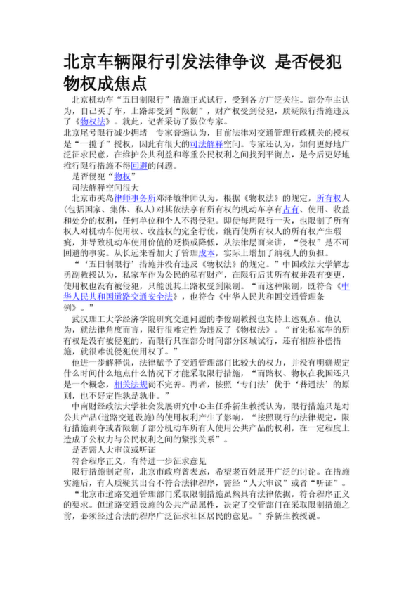 北京車輛限行引發法律爭議 是否侵犯物權成焦點(25.66KB)