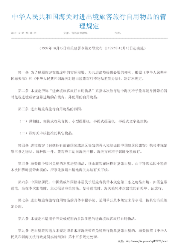 中華人民共和國海關(guān)對進(jìn)出境旅客旅行自用物品的管理規(guī)定(13.50KB)