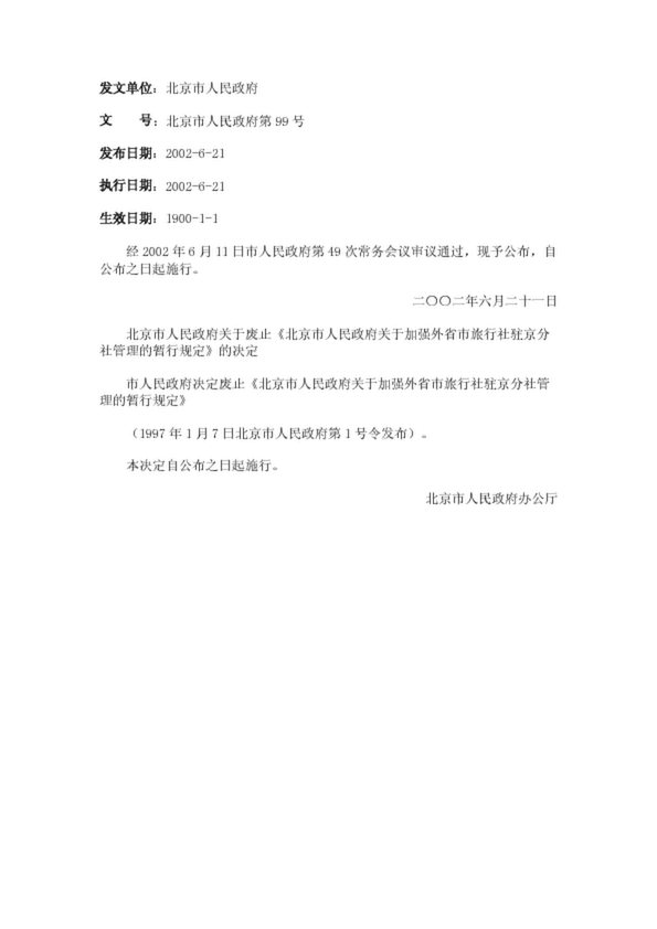 北京市人民政府關于廢止《北京市人民政府關于加強外省市旅行社駐京分社管理的暫行規定》的決定(0.79KB)