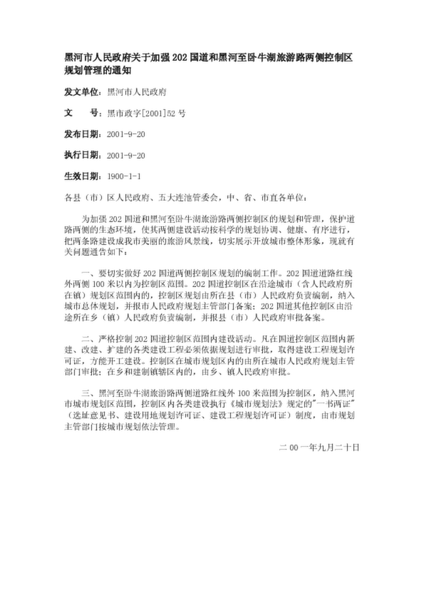 黑河市人民政府關于加強202國道和黑河至臥牛湖旅游路兩側控制區規劃管理的通知