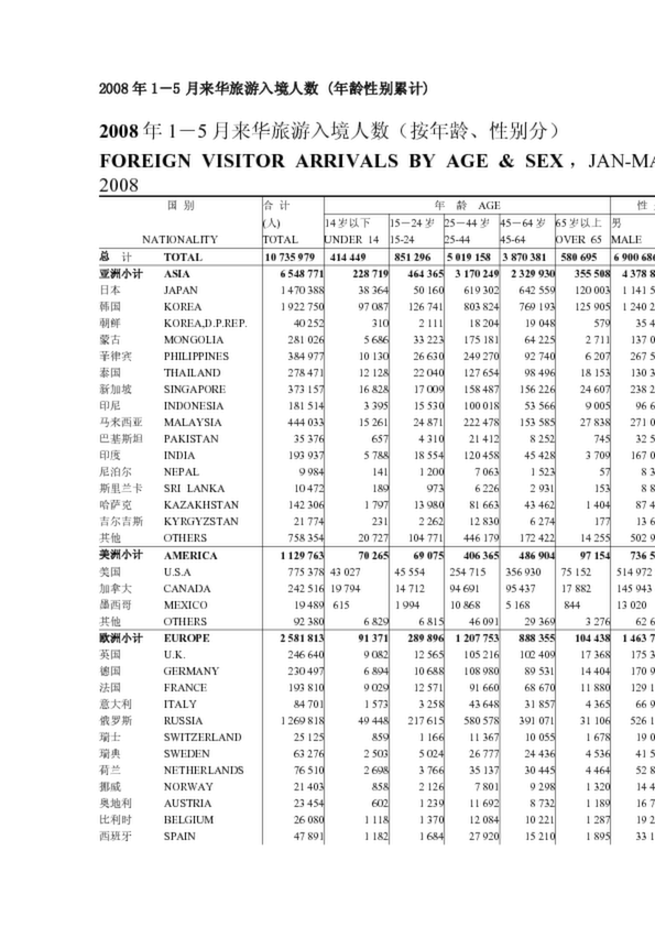 2008年1-5月來華旅游入境人數(shù) (年齡性別累計)(0.14MB)