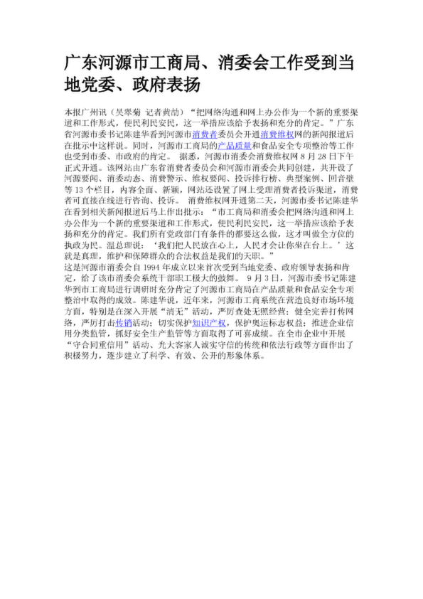 廣東河源市工商局、消委會(huì)工作受到當(dāng)?shù)攸h委、政府表揚(yáng)